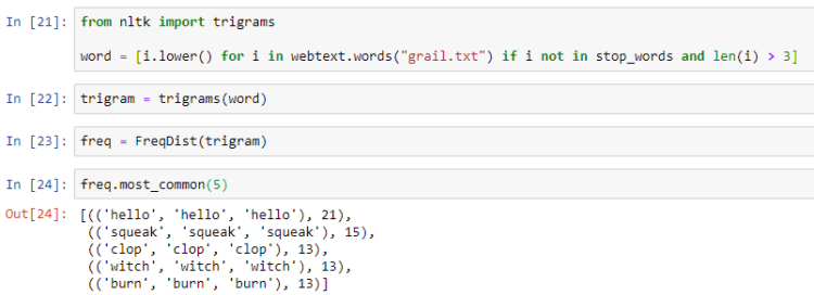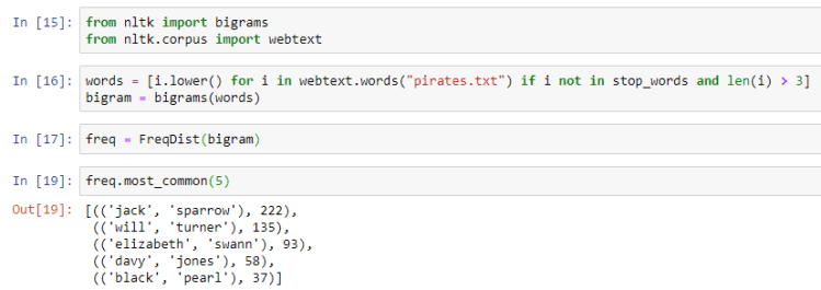 We first break the text into word tokens and then pass those tokens to the bigrams module imported from nltk to convert the word tokens into bigrams. We then pass it on to FreqDist and use the most_common method to look at the top 5 most common words.