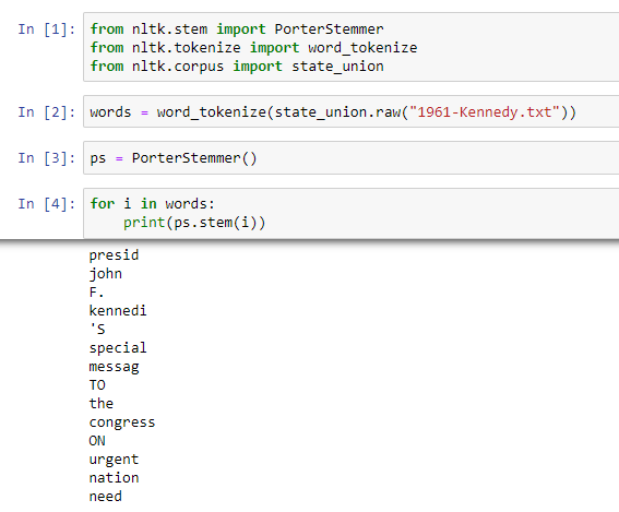 This is a process for text normalization which involves reducing words to their root/base words from their derived words. NLTK provides us the PorterStemmer class to perform stemming operations on word tokens.