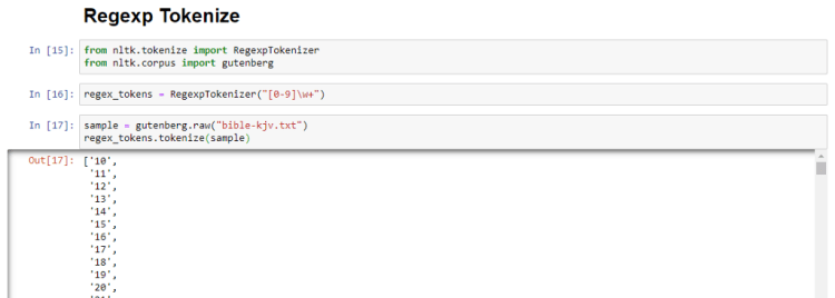 Here, we will use RegexpTokenizer to match with a regex which will give us a list of all the numbers present in the Bible.