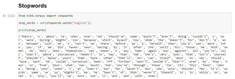 Fortunately, NLTK has a list of such useless words of 16 different languages. These are called stopwords. Using these, we can filter out the data and clean it.