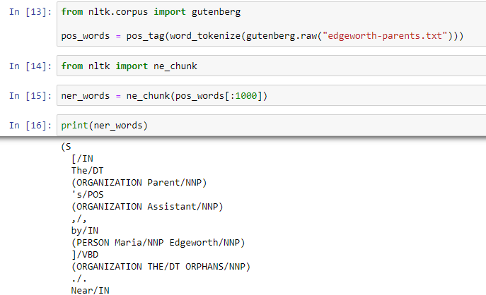 In order to use this module, we have to pass in parts-of-speech tags as the argument. So we first import the necessary modules, tokenize the text into words and find out its parts-of-speech and then pass it to ne_chunk which will give us the proper results.