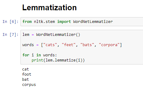 After creating an instance of the WordNetLemmatizer class, we call the method lemmatize to lemmatize the words. Words are reduced to their original form while still retaining their meaning.