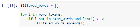 On line 17, we loop through the word tokens and then select only those words which are not present in the stopwords list and whose length is greater than 3.