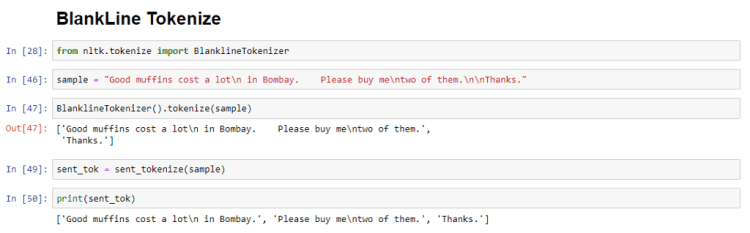 In this example, both RegexpTokenizer and BlankLineTokenizer are used on the same sample text which will give a clear idea on both these functions.