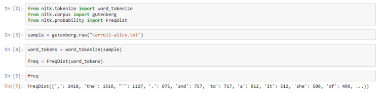 After tokenizing into words, we pass the tokens into the object declaration of the FreqDist class.