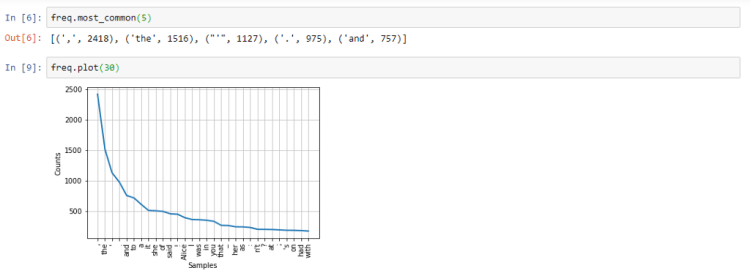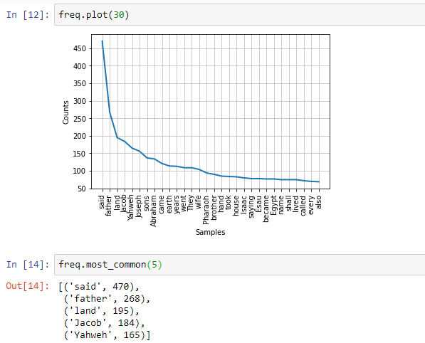 The most_common method of freq object can be used to see the most common occurrences of the words. The plot method can be used to graph a plot of the same.
