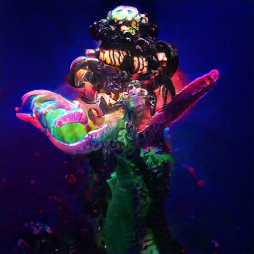 The images created by the network look very bizarre and surreal, in a way that makes them fascinating. It creates objects that often resemble something, but nothing you could name and identify, residing in the fuzzy space in-between, open for interpretations. I have a feeling they somehow touch the deep, unconscious parts of my mind, the same way weird, incomprehensible dreams do.