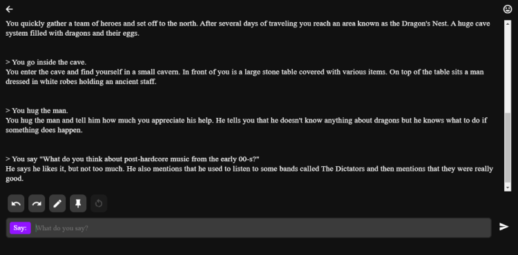 The program running the game is built on top of GPT-2, a neural network model that was trained on a huge database of text in English to learn the structure and dependencies of human language. When the famous OpenAI lab first created GPT-2, at first they didn’t want to release it to the public because it was supposedly too powerful and could be easily abused for misinformation. You can type in any scenario, even really absurd, and the model will make some sense of it. Even though it does not have any explicit knowledge about the world and the events, it has enough understanding to make a coherent, convincing story including several characters and a chain of events. Sometimes you can see that it doesn’t really understand how the real world works, but it gives an interesting, surreal vibe to the adventure.