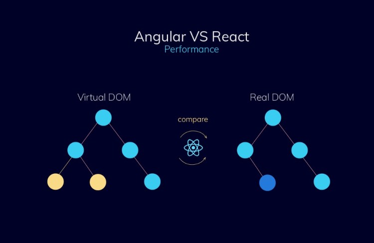 Angular utilizes Regular DOM which uses change detection to find which component needs updates. Even if the changes take place in one element, it updates the whole structure. React uses a Virtual DOM that helps to increase general speed and application’s performance. When one change is done, it updates only specific elements and doesn’t influence the other parts. It’s considered to be faster than Regular DOM.