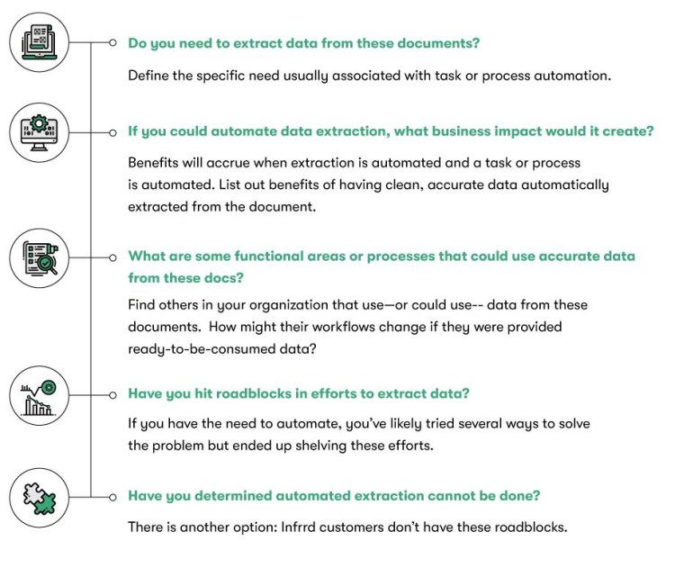 Don’t brush off answering this question. By thinking deeply about the effects of automation, you’ll come up with ways that automating the manual data extraction process can affect your business outcomes.