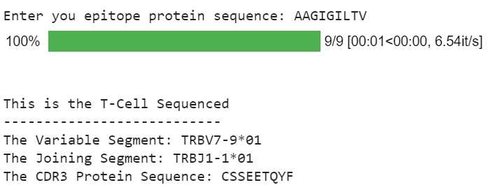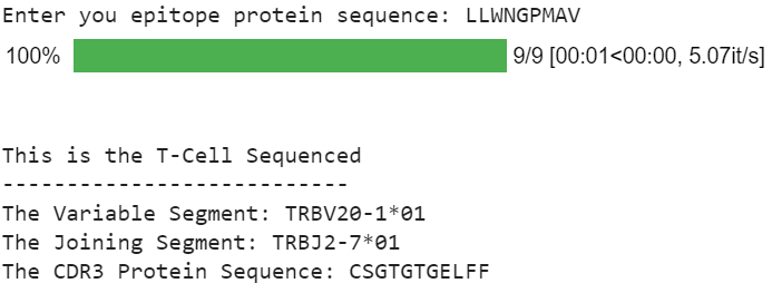 Given the epitope protein sequence of an antigen, can we predict the V-Segment, J-Segment and CDR3 Protein sequence of the TCR that will bind with the antigen? This is the fundamental question I tried to answer using machine learning. To make this easier, I broke up the problem into three manageable goals. The first goal is to create a model to predict the V-segment, one model to predict the J-segment and one model to predict the CDR3 sequence.