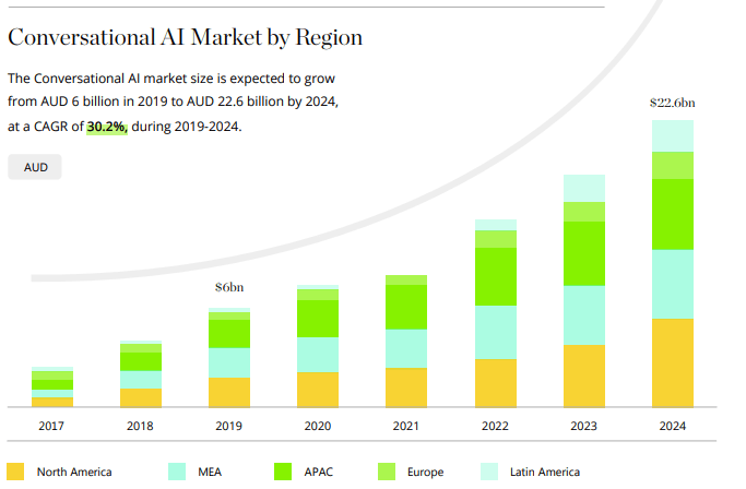 The impact of conversational AI is becoming more noticeable, and we can see it from the growth of the conversational AI market, which will reach AUD 22.6 billion or USD 17 billion by 2024: