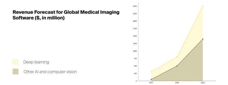 The radiology department of an average healthcare facility is likely searching for improvements. Even before COVID-19, 45% of radiologists experienced burnout at one point in their career. They felt overwhelmed with the administrative burden and the large number of images they had to check manually, which could reach up to a hundred scans per day. Additionally, radiology practice is lacking non-invasive methods for tissue classification. Invasive procedures take time and cause stress to patients. Luckily, AI healtchare solutions are coming to the rescue. The global AI radiology market was valued at $21.5 million in 2018, and it is forecast to reach $181.1 million in 2025, growing at a staggering CAGR of 35.9%. However, despite the numerous advantages of AI in radiology, there are still challenges preventing its wide deployment. How to properly train machine learning to aid radiology? Where does AI stand when it comes to ethics and regulations? How to make a strong business case for investing in artificial intelligence in radiology?