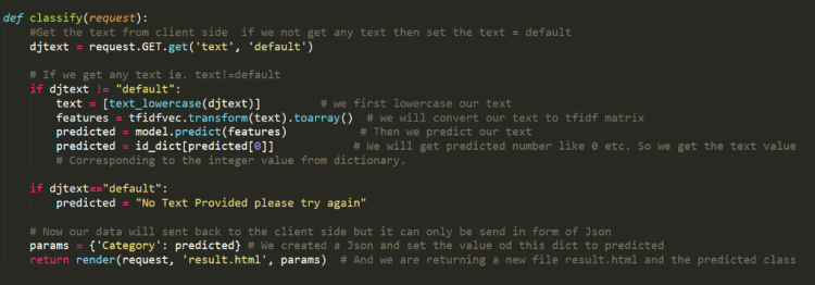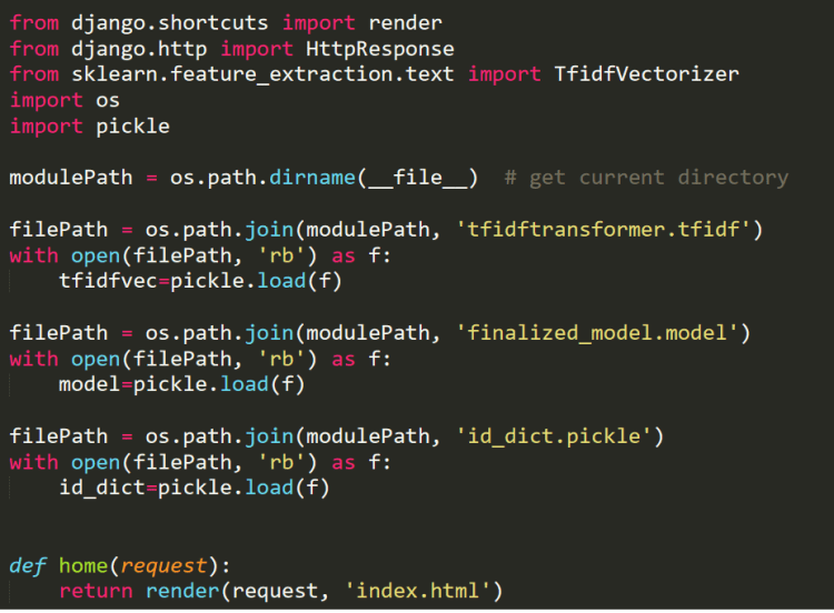 But before that, we also need to load our save model, tfidf transformer, and id_to_label dictionary. So first copy the three files that are already created in the first part to the “newsclassifier” folder in which views.py is present and add the following code in views.py.