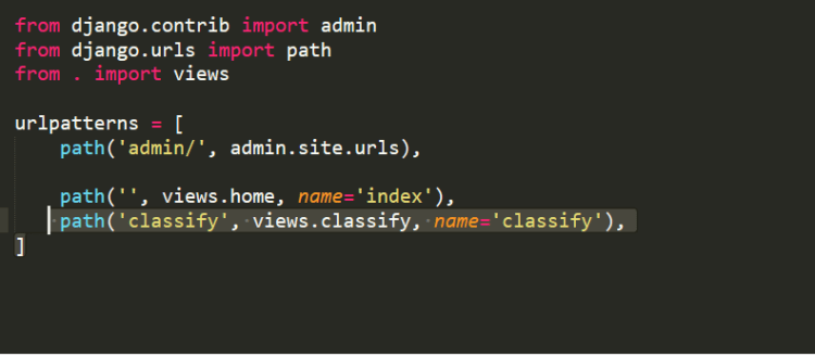 You can see that I am using GET to send data to views.py but we should also define something at views.py to receive it and as the action is sending to classify. So it means that we should define a function in views.py named classify and then accept the data that is sent from the client(homepage) to the server.